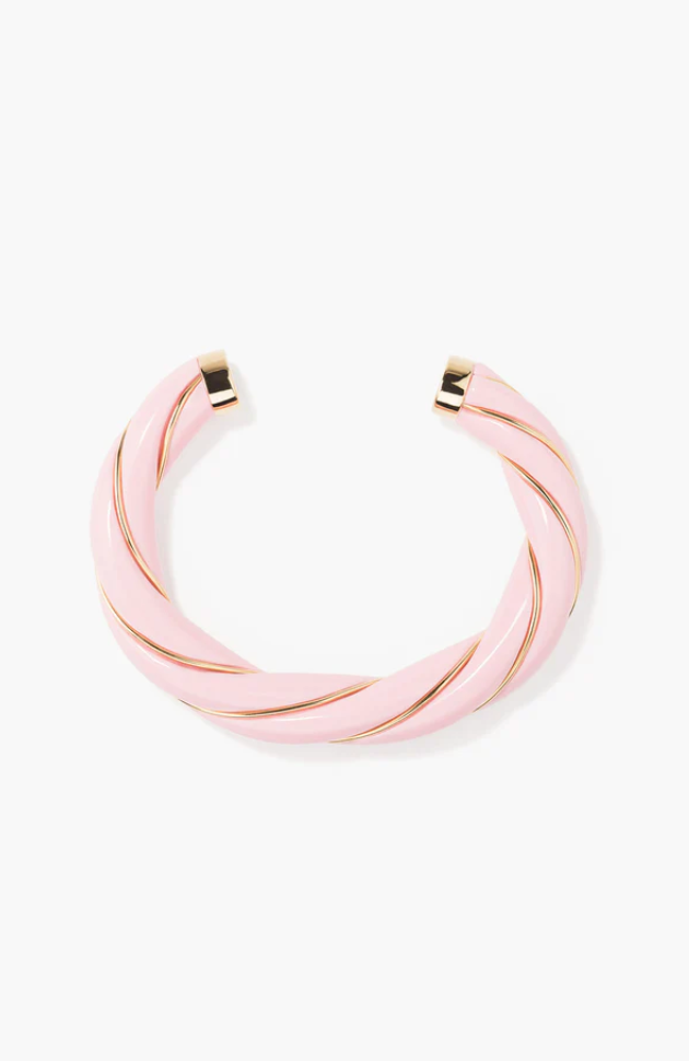 Twisted Diana bangle in pink-tinted resin, gilded with 750/1000 yellow gold.