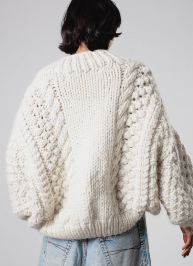 A sculptural hand-knit from Mr. Mittens, defined by its exaggerated texture and easy volume. Crafted in Peru from 100% wool, each piece is made entirely by hand, giving it a weight and softness that feel both grounding and effortless.