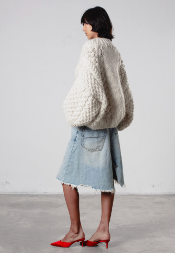 The open stitchwork and deep rib collar lend quiet structure to the slouchy, oversized shape — a balance of craft and ease that’s become a Mr. Mittens signature.