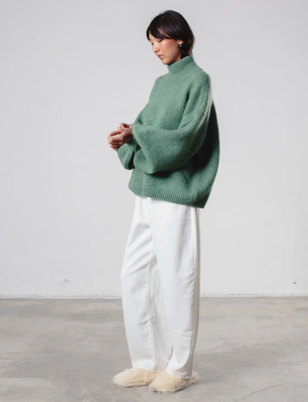 The Noami mock neck embodies the essence of relaxed style. Crafted from luxurious alpaca blend, it envelops you in soft, lightweight warmth. The oversized fit creates an effortlessly cozy silhouette, while the voluminous balloon sleeves add a modern, feminine touch. Finished with a high neckline for a refined edge and extra comfort, this sweater is the perfect blend of comfort and style.